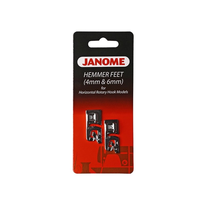 Набор лапок подрубателей (4 и 6 мм) предназначен для использования на швейных машинах Janome с горизонтальным челноком и шириной зигзага от 5 до 7 мм.
